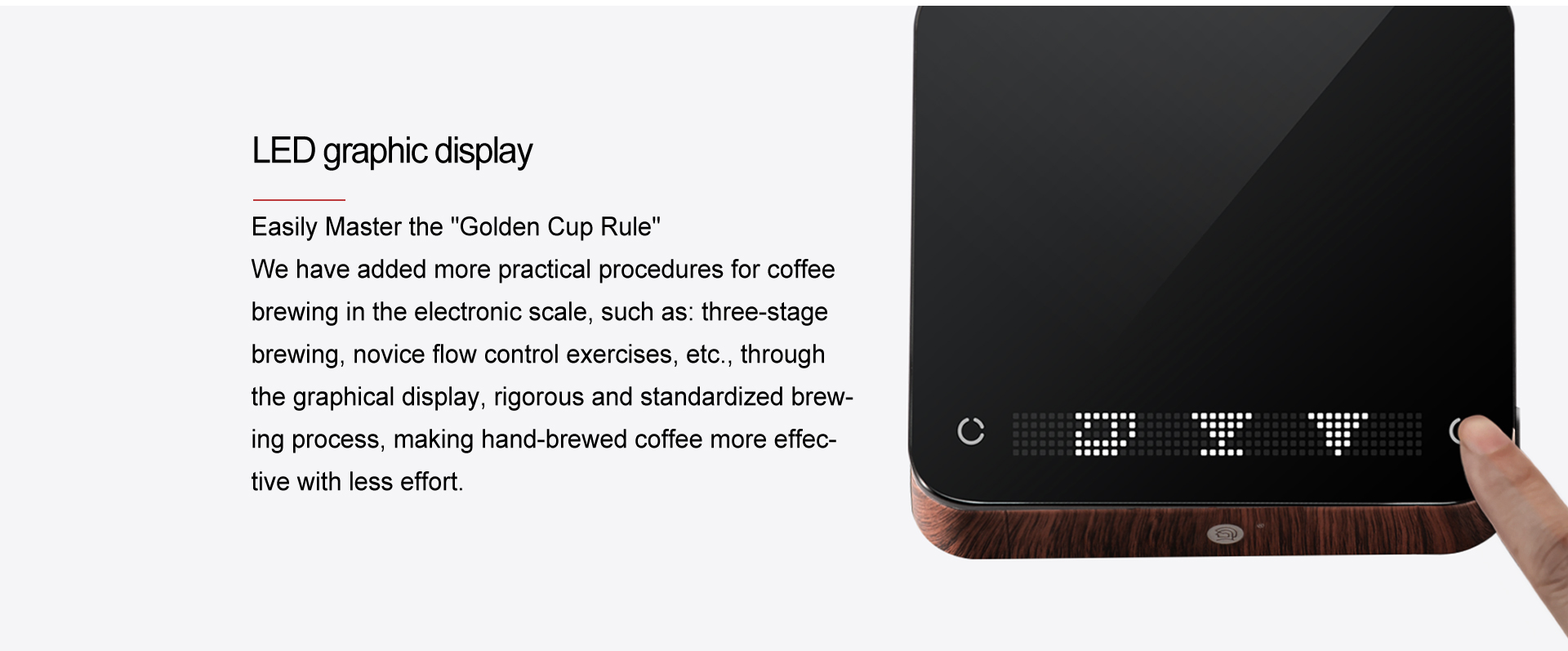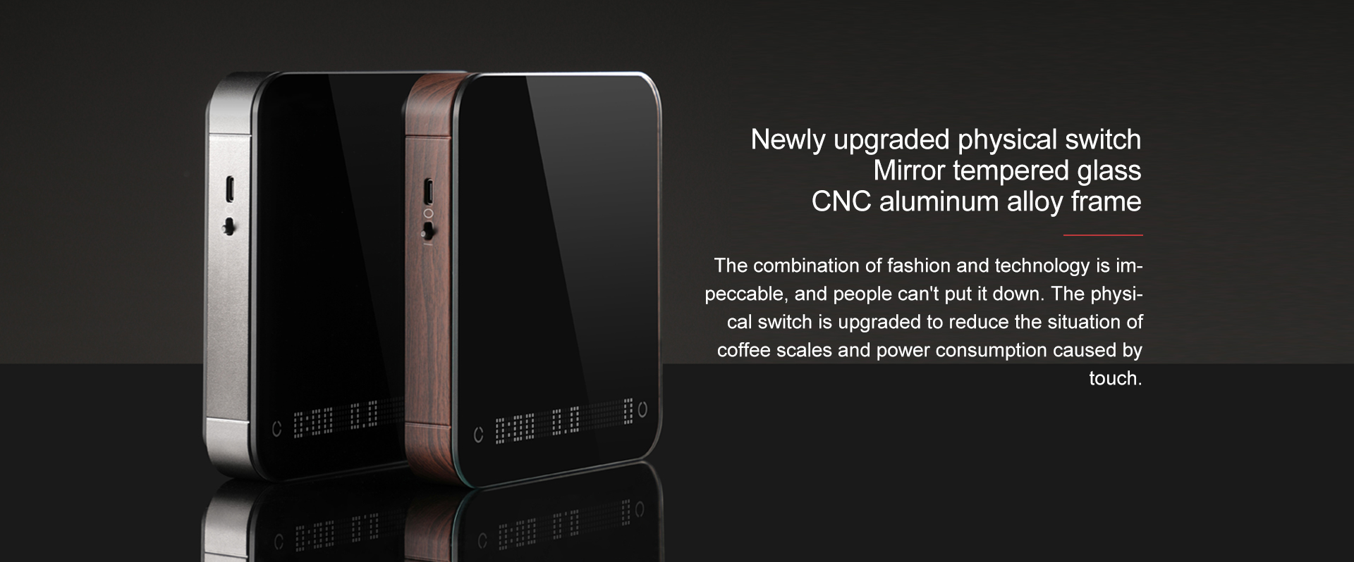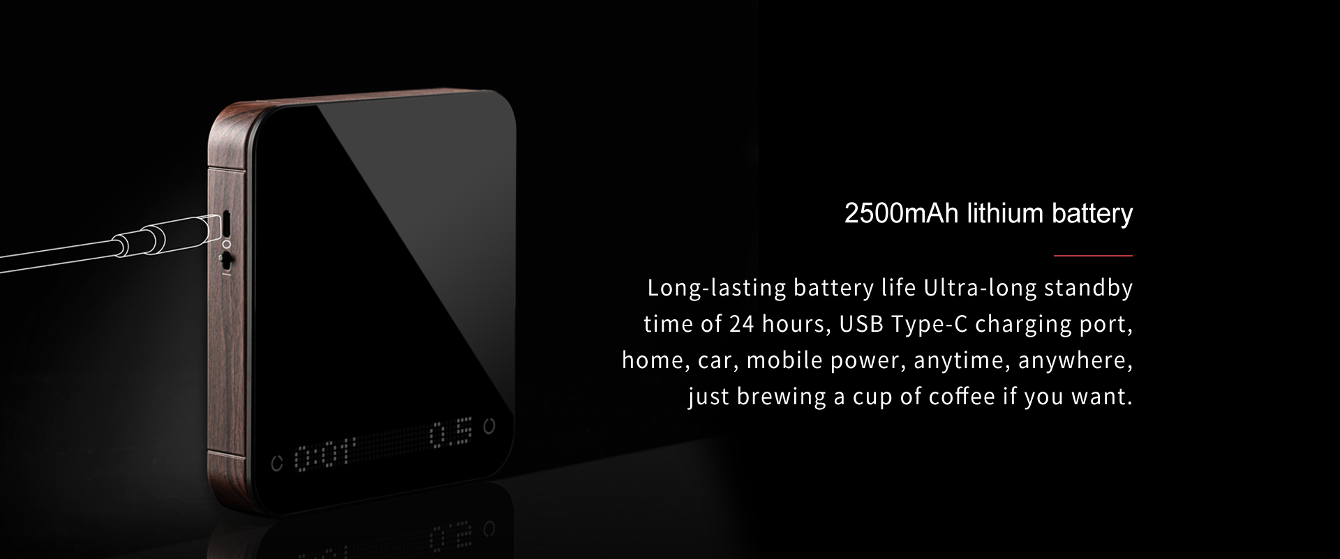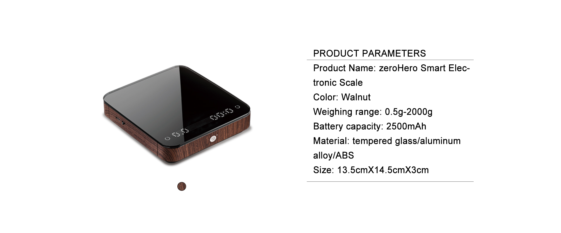 Product Name: zeroHero Smart Coffee Scale Color: walnut Weighing range: 0.5g-2000g Battery capacity: 3.7V 2500mAh lithium battery Material: tempered glass/aluminum alloy/ABS Size 13.5cmX14.5cmX3c